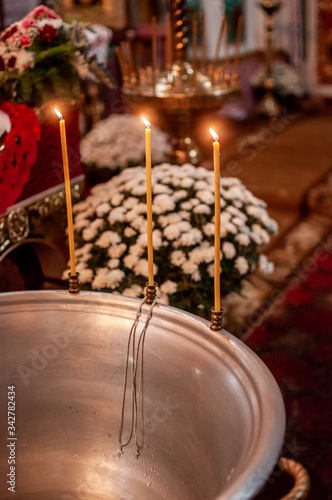 © Galka3250, Naklejka premium fire candles near the silver bowl with water