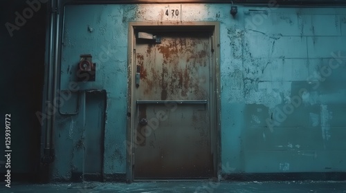 © Thirawat, Naklejka premium fire exit door located in a vintage, old building, showing its aged metal frame and peeling paint