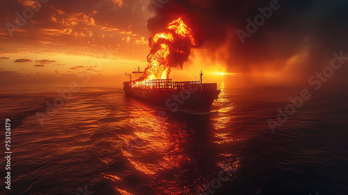 © JKLoma, Fototapeta premium fire is burning large cargo ship while traveling to deliver goods at sea during sunset,generative ai
