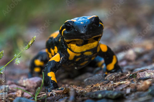 Fototapeta premium Fire salamander at eye level very interested