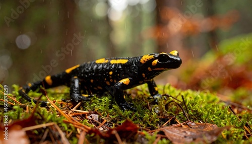 © Zevania, Fototapeta premium Fire Salamander hunts on rainy forest