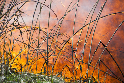 © SGr, Fototapeta premium Fire, strong smoke. Burning reed in the swamp. Natural disaster