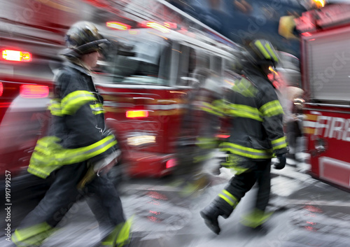 © bluraz, Fototapeta premium fire trucks and firefighters brigade in the city