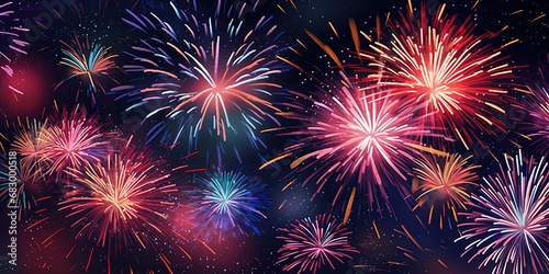 Naklejka premium Fire work explosion at night sky, a device containing gunpowder and other combustible chemicals that causes a spectacular explosion when ignited, used typically for display or in celebrations