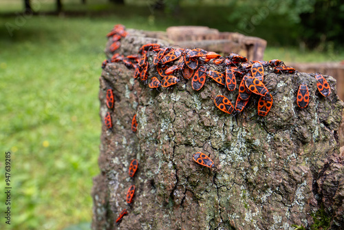 © David, Fototapeta premium Firebug - Pyrrhocoris apterus, common red and black bug from European meadows, gardens and woodlands, Zlin, Czech Republic.