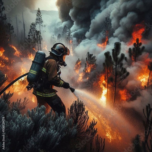 © Silvia Bogdanski, Obraz premium Firefighter Battling a Fierce Forest Fire with Bravery and Resilience