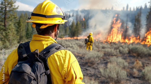 © siraphol, Naklejka premium Firefighter battling wildfire in scorched landscape, focused on flames and smoke