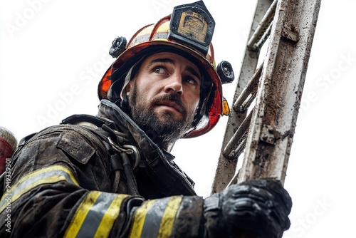 © Nutthanon, Naklejka premium Firefighter Climing Ladder.