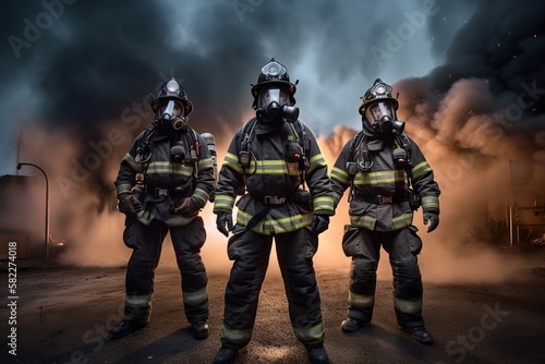 © iridescentstreet, Fototapeta premium Firefighter crew, a brave and confident team in the night of disaster. Generative AI
