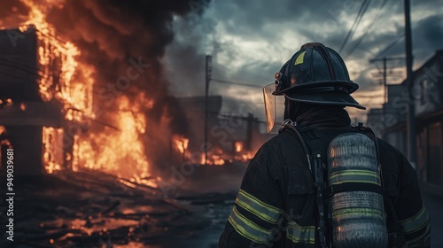 Naklejka premium Firefighter Facing Burning Building