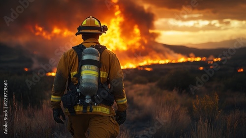© Lemdah, Naklejka premium Firefighter facing massive wildfire at sunset.