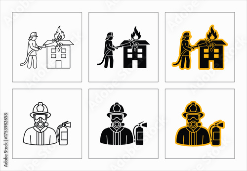 Obraz premium Firefighter Illustration Set Rescuing Burning Building With Water Hose And Fire Extinguisher