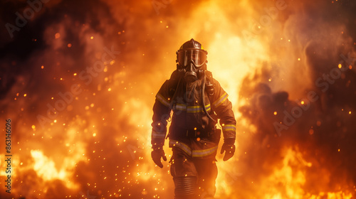 Fototapeta premium Firefighter in action surrounded by intense flames.