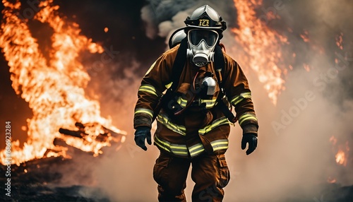 Fototapeta premium Firefighter in danger situation - emergency scene with fire, wearing safety suit