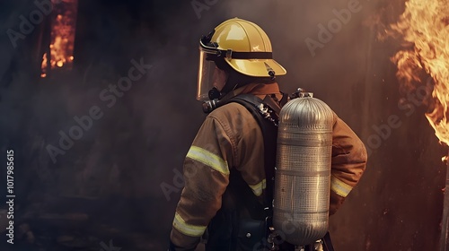 Fototapeta premium Firefighter in full gear, standing near a blaze.