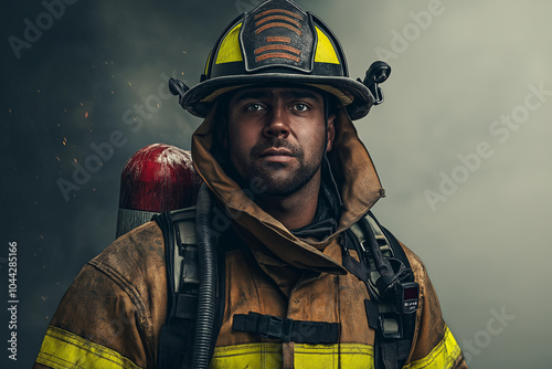 © Sinovel, Fototapeta premium Firefighter in Full Gear with Smoke Background