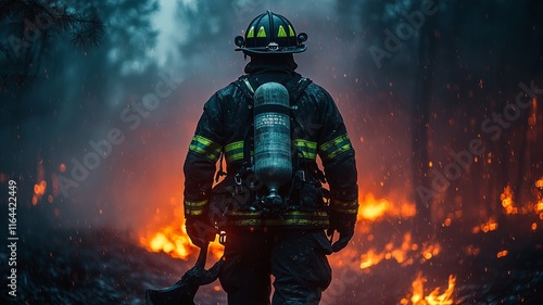 © Zilfa, Fototapeta premium Firefighter in Gear Walking Through Flames