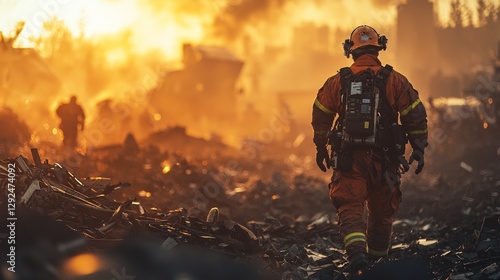 © Shiroo, Fototapeta premium Firefighter in Orange Suit Amidst Daring Flames