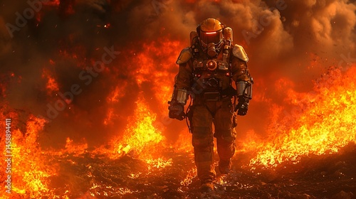 Fototapeta premium Firefighter in protective suit walking through inferno.