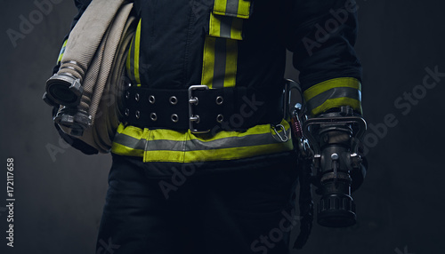 © Fxquadro, Fototapeta premium Firefighter in uniform holds fire hose.