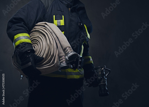 Fototapeta premium Firefighter in uniform holds fire hose.