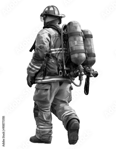 Fototapeta premium Firefighter in uniform walking away, equipped with air tank, showcasing bravery and readiness for emergency response , PNG , transparent background