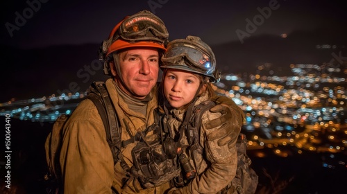 © Azriel, Fototapeta premium Firefighter parent and child nighttime support portrait