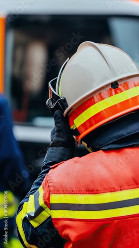 © pvl0707, Obraz premium Firefighter preparing for action in front of fire truck during emergency response situation