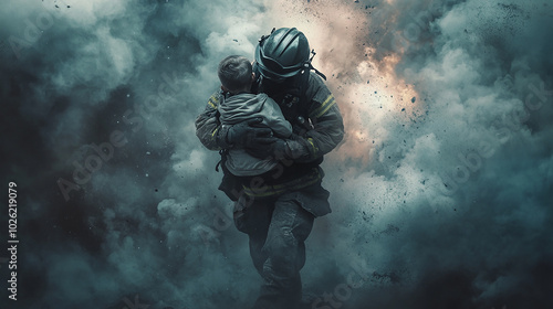 Fototapeta premium Firefighter rescuing a child from a smoke-filled room