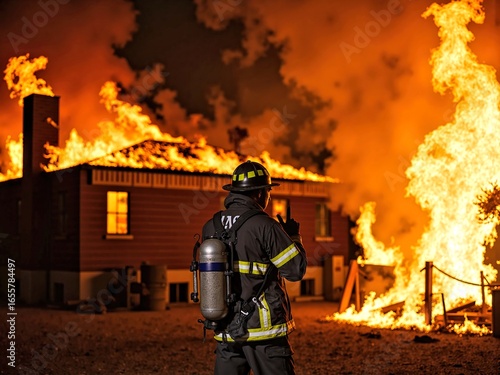 Fototapeta premium Firefighter Standing in Front of Burning House with Big Flames