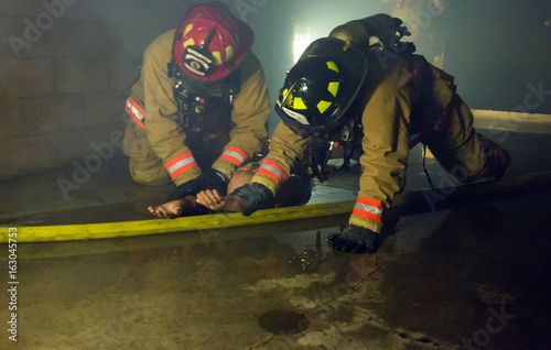 © ecummings00, Fototapeta premium Firefighter training exiting the building with a victim
