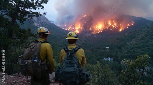 © Nugraha, Naklejka premium Firefighter Watching Wildfire in Mountain
