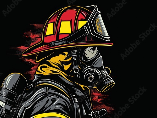 © MADGALLERY, Obraz premium firefighter wearing full gear, black background