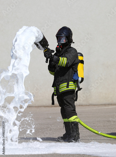 Naklejka premium Firefighter with Protective Mask and Oxygen Bottle as he operates lance which sprays white extinguishing foaming agent