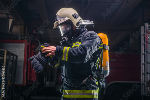 Naklejka premium Firefighter with protective uniform wearing oxygen mask