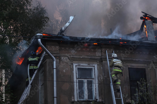 © Кирилл Дмитриев, Fototapeta premium firefighters extinguish a fire in an old house
