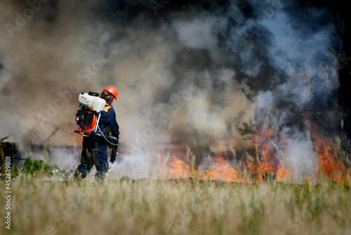 © andrys lukowski, Obraz premium Firefighters extinguish a forest fire in the reserve on a summer day
