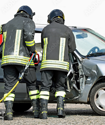© ChiccoDodiFC, Fototapeta premium firefighters open the door of a car with a shear