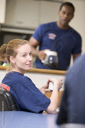 Fototapeta premium Firefighters relaxing in the staff kitchen