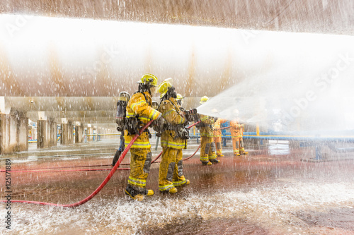 © kaiskynet, Fototapeta premium Firefighters training, foreground is drop of water springer, Selective focus