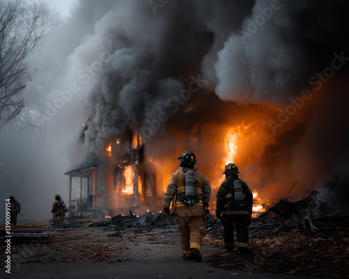 © modestil, Obraz premium Firefighters trying to save a house from burning to the ground