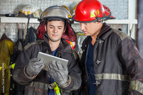 © Tyler Olson, Obraz premium Firefighters Using Digital Tablet At Fire Station