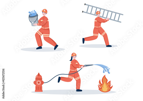© denayune, Obraz premium Firefighters With House Fire Engines, Helping People and Animal, Using Rescue Equipment in Various Situations. Vector Illustration
