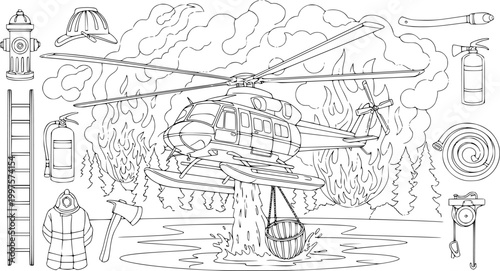 © Assem, Fototapeta premium Firefighting Helicopter Coloring Page Illustration