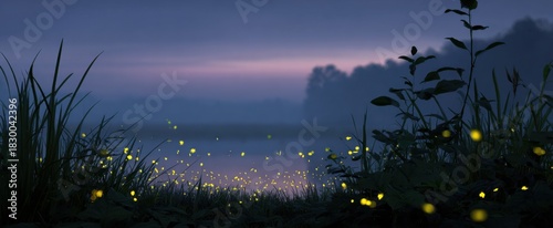 Fototapeta premium Fireflies gently lighting up the twilight vibe with their cozy little glows