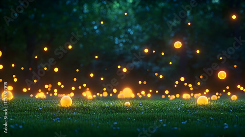 © Lailatul, Naklejka premium Fireflies illuminate the grass in a forest. Nature scene for magical, fantasy, or summertime themed projects