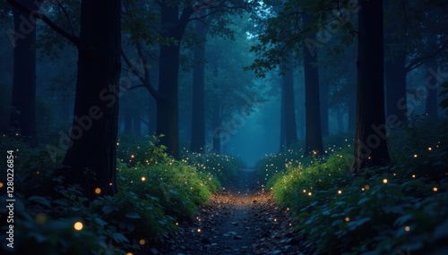 Obraz premium Fireflies twinkle, illuminating a tranquil forest path Dark, lush foliage, calm night , bug, summer