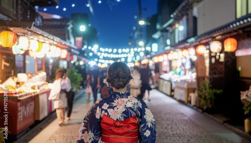 © bizdesigner.1, Obraz premium Firefly_浴衣姿の女性が夏祭りの屋台通りを歩いている後ろ姿、ぼかされた提灯と夜の光、ノスタルジックな雰囲気、リアル調 835855