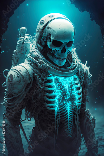 Fototapeta premium Firefly bacteria ghostly glow armour spacesuit with grinning death skull on the surface of Europa AI-Generated