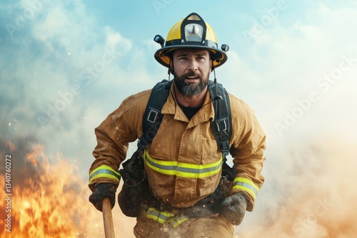 Fototapeta premium Fireman firefighting mission. Brave firefighter charging through smoke and...